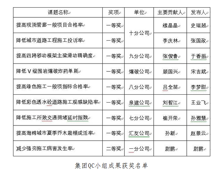 中國(guó)市政工程協(xié)會(huì)授予集團(tuán)“全國(guó)市政工程建設(shè)QC小組活動(dòng)優(yōu)秀企業(yè)”,九分公司張俊魯被評(píng)為“全國(guó)市政工程建設(shè)QC小組活動(dòng)優(yōu)秀推進(jìn)者”。